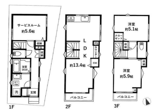 | 延べ面積 | バルコニー方向 | ||